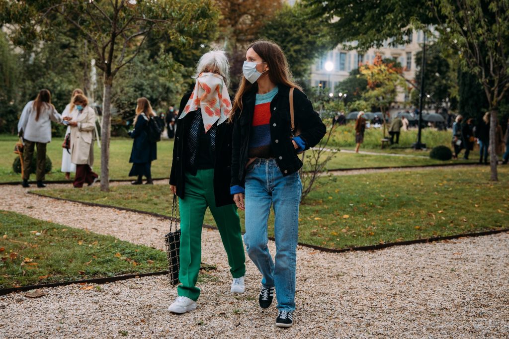 Aside from masks, which were the biggest visual change in our street style coverage, the trend was for easier, more casual clothing that merged pragmatism and personality. We saw a lot of great blazers and jeans—often flared or bootcut for a bit more polish—and grounded, hardworking boots and sneakers. Showgoers wore those sensible shoes with silk dresses and suits (don’t believe the “tailoring is dead!” headlines) and favored generous cuts over body-conscious ones. Our eyes skipped over the “total looks” borrowed from the runway, once a standard practice that felt forced this time around. Instead, we zoomed in on surprising details and artfully thrown-together outfits: vintage pieces mixed with new, outsize proportions, and spontaneous layers.