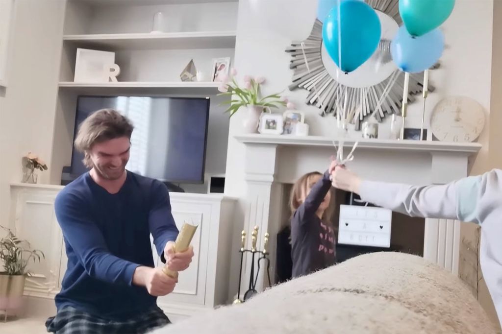 Mom then has her daughter release blue balloons — signifying a boy in high gender-reveal tradition — while the father prepares to follow suit with his baby-identifying bazooka.