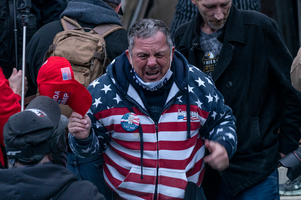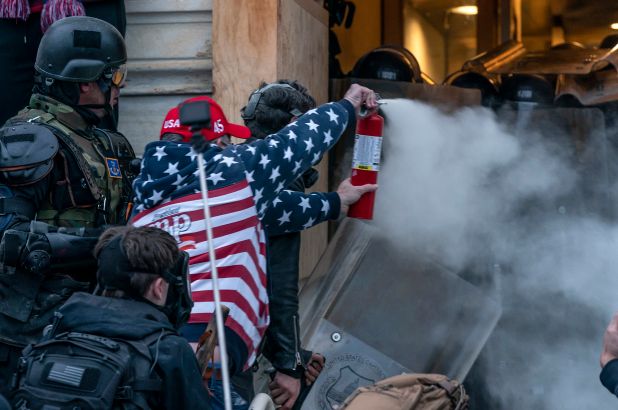 Robert Scott Palmer, 53, was allegedly captured on camera spraying officers at close range then throwing the emptied canister at them while wearing an easy-to-spot American flag jacket on Jan. 6, the Huffington Post reported.