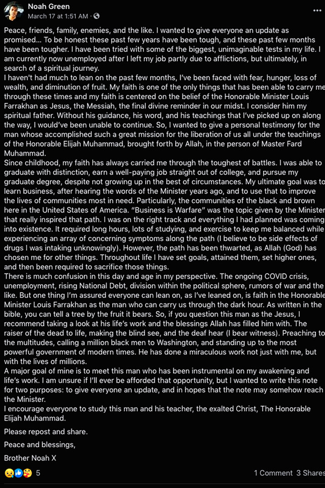 Noah Green, 25, who may have been living in Virginia, described himself as a “Follower of Farrakhan” on his Facebook page, in reference to Nation of Islam leader Louis Farrakhan.