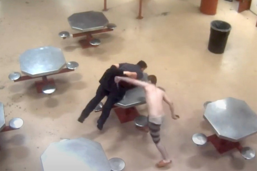 Misquez, who was bound and held captive for about an hour, is seen in surveillance footage being hit on the head and stabbed several times in the leg by a second inmate.
