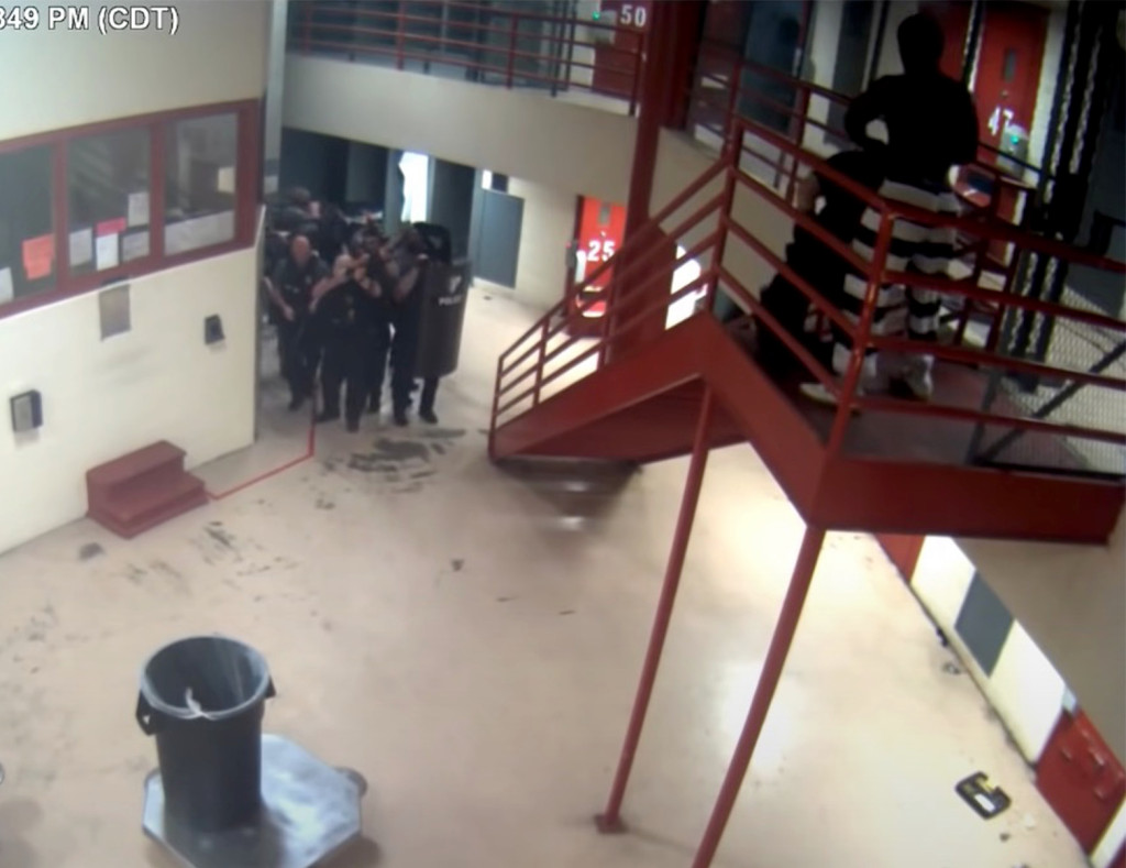 Inmates in an Oklahoma City jail took a guard hostage, beating and stabbing him several times before one of the suspects was shot dead, graphic video shows.