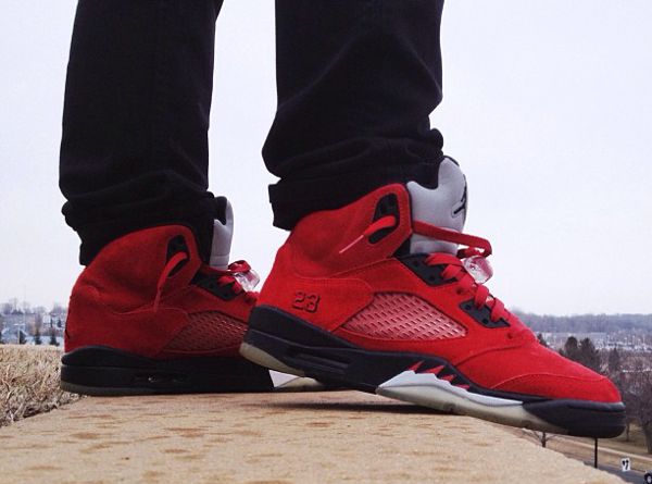 The “Toro Bravo” Air Jordan 5 from the 2009 “Defining Moments” Pack is releasing in 2021. It features a predominantly red suede upper with a black midsole and a translucent outsole. Release date is April 10, 2021 at a retail price of $190.