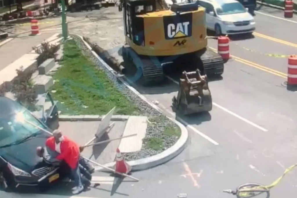 But seconds later, the Sonata roars back into the picture, from right to left — without its driver — and it rams the alleged gunman a second time, this time in reverse.