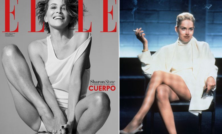 The Oscar-nominated actress, 63, nodded to her iconic leg-crossing scene from “Basic Instinct” for Elle Spain’s May 2021 cover, posing on a wooden stool in just a white tank top, underwear and gold heels.