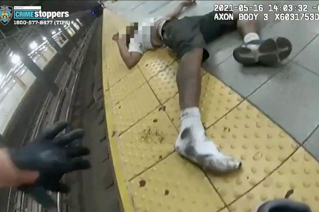 Body cam footage posted to Twitter shows one of the officers signaling the drive of the train with a flashlight as a northbound A train lights up the tunnel on the way to the station.