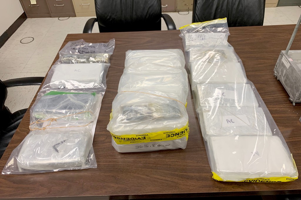 Over a dozen bricks of what appears to be cocaine and heroin are also shown in the images, some of which are marked with “AC” on top.