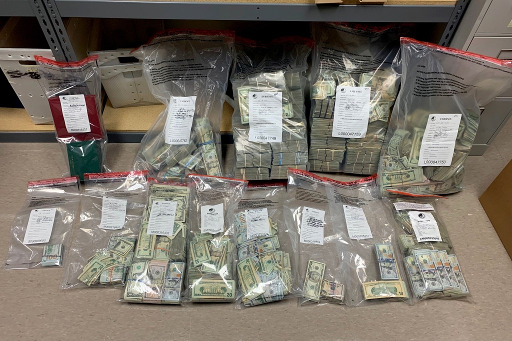 The images released by the Suffolk County District Attorney’s Office show twelve evidence bags stuffed with about $1.5 million in cash broken down into ones, fives, twenties and hundred dollar bills.