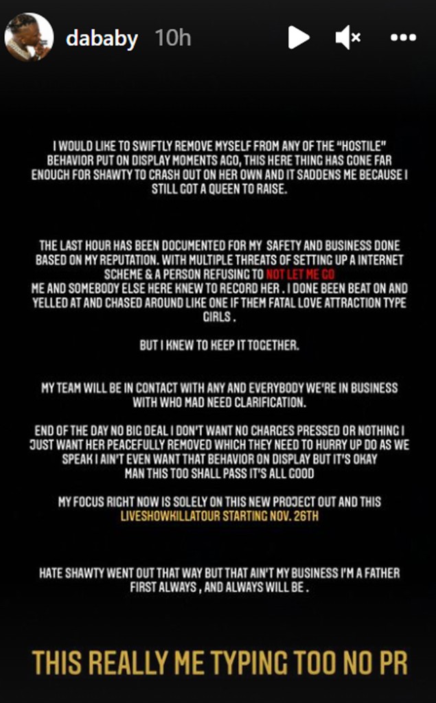 Meanwhile, DaBaby, 29, posted his own statement about the public spat, claiming that he was “threatened multiple times” with an “internet scheme” and was recording himself for safety and for “business done based on my reputation.”