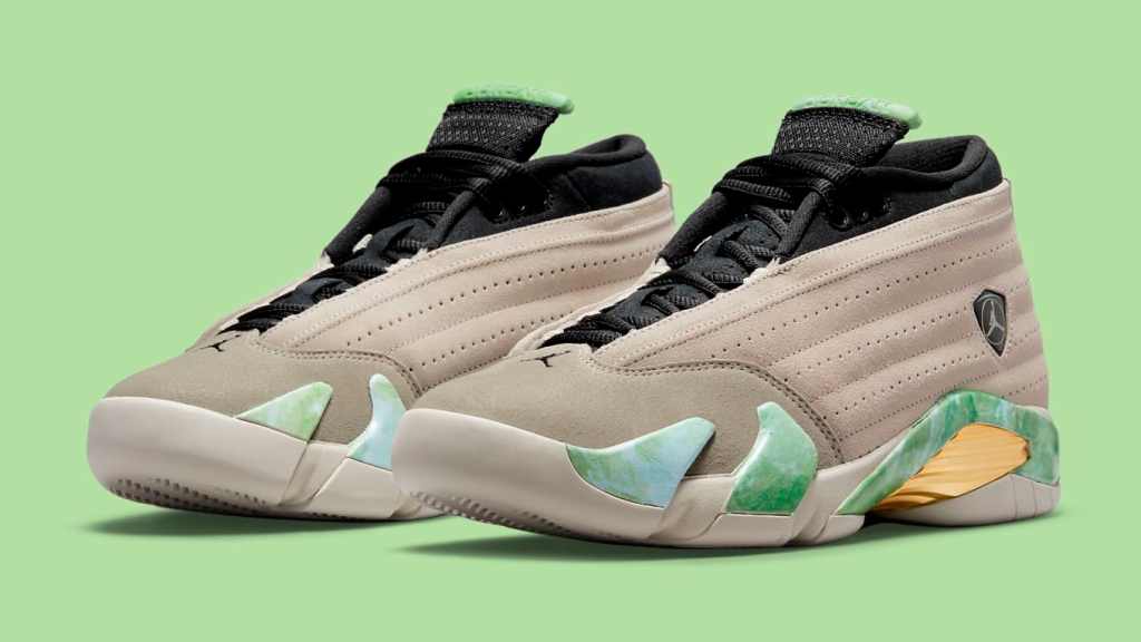 Such is the case on the Aleali May x WMNS Air Jordan 14 Low Retro “Fortune” from 2021. Inspired by a gold bracelet her grandmother gave her, this sporty silhouette from 1999 is made modern through sandy suede on the upper and jade marbling on the midsole.