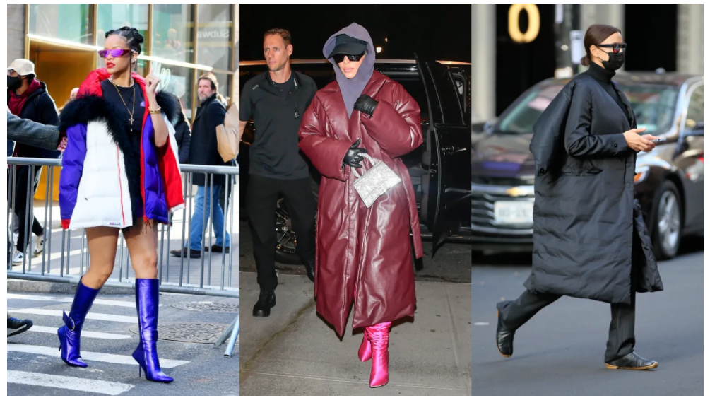 It’s easy to toss fashion out the window when temperatures plummet. It’s hard to deliver a look when the brisk air feels like knives against your skin! Generally, a giant puffer coat is the sign of fashionable defeat. It doesn’t matter how fabulous the outfit beneath is, a matte black, ankle-length puffer rarely has you feeling your most stylish. But, it turns out you can be both snuggly and formal this winter—at least, that’s what celebrities are proving. Stars like Rihanna, Irina Shayk, and Bad Bunny have all elevated their puffer coats by choosing styles in unexpected colorways or silhouettes.