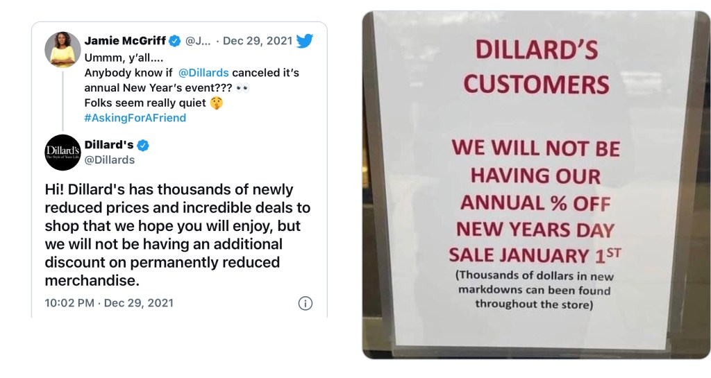 KARK 4 News anchor Mallory Brooks and other users on social media shared a screenshot of the sign addressed to Dillard’s customers that said: “We will not be having our annual % New Years Day sale January 1st,” adding “Thousands of dollars in new markdowns can be found throughout the store.”