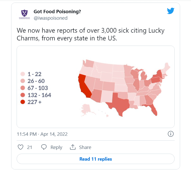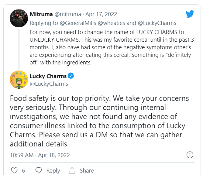 “Food safety is our top priority. We take your concerns very seriously,” the official Lucky Charms Twitter shared in a message about the investigations. “Through our continuing internal investigations, we have not found any evidence of consumer illness linked to the consumption of Lucky Charms.”