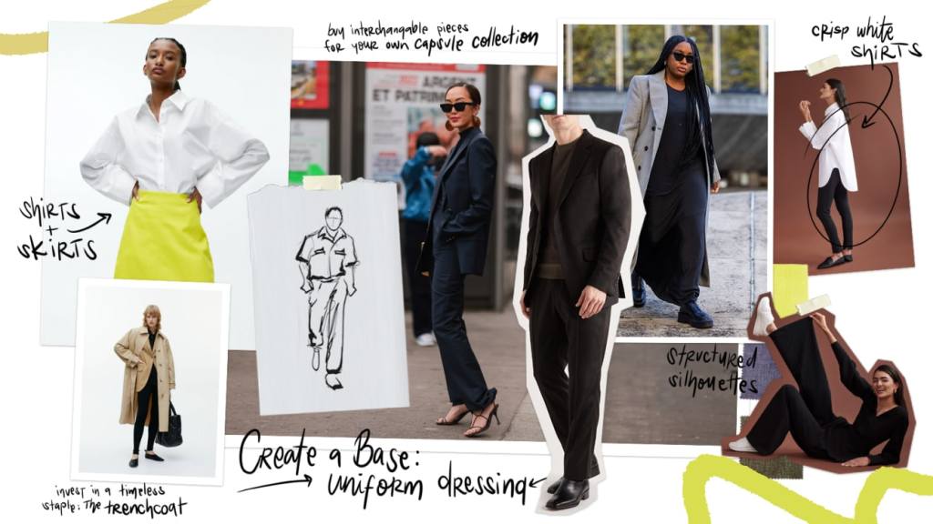 Top image credits: Clockwise from left to right: Yellow skirt and shirt look courtesy Arket; Navy suit street style look via Getty Images; Brown suit courtesy Mr Porter; Maxi dress and blazer street style look via Getty Images; White shirt look courtesy Dai; Black trousers and oversize white shirt look courtesy Dai; trench coat look courtesy Arket.