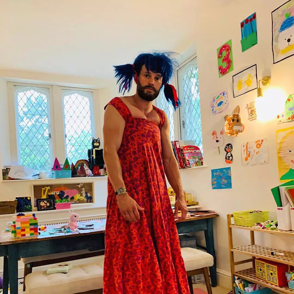 Blue might just be Jamie Dornan’s color! The Belfast actor shared a photo of himself in a blue wig (complete with pigtails!), red dress and gold heels, courtesy of his daughters, Dulcie, Elva, and Alberta.