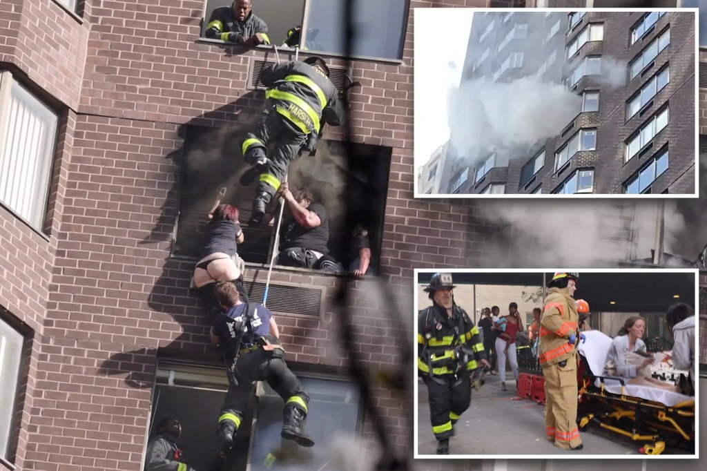 As thick, black smoke poured out of the building, daring firefighters used a rope to reach windows and rescue multiple frightened residents.